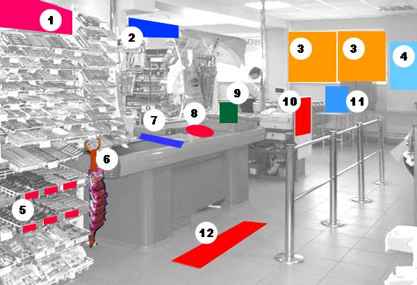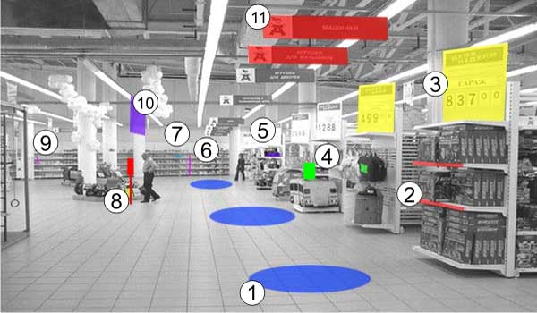 в ценникодержатель6. ценникодержатель7. напольная наклейка8. постер9. ростовая фигура10. шелфтокер, "лучшая цена"11. наклейка на холодильник12.полочный
