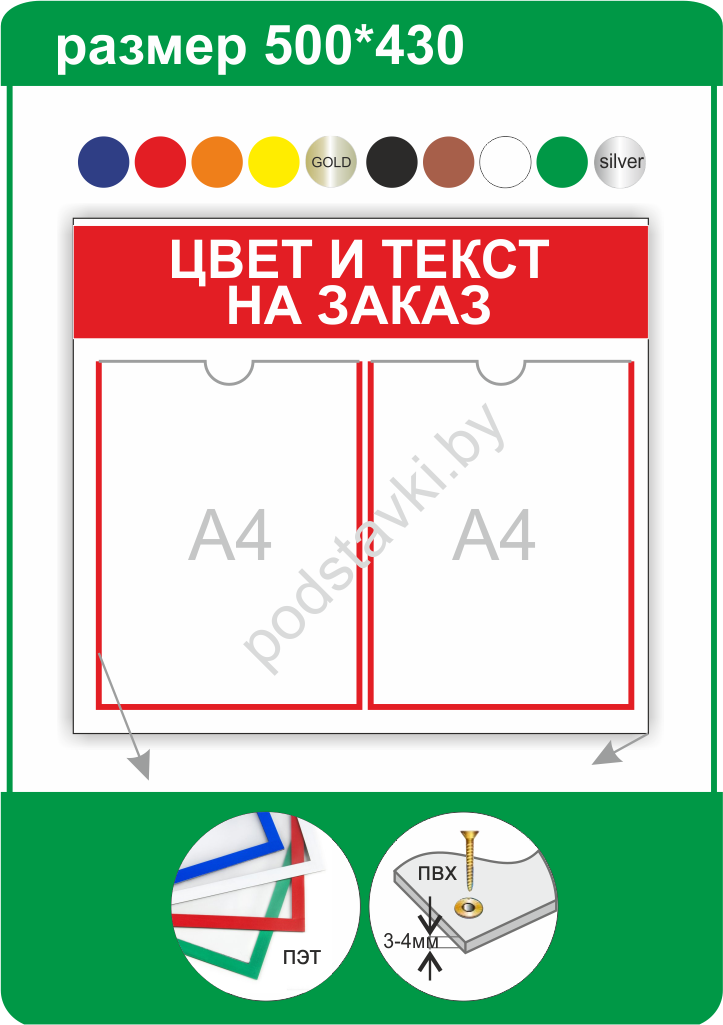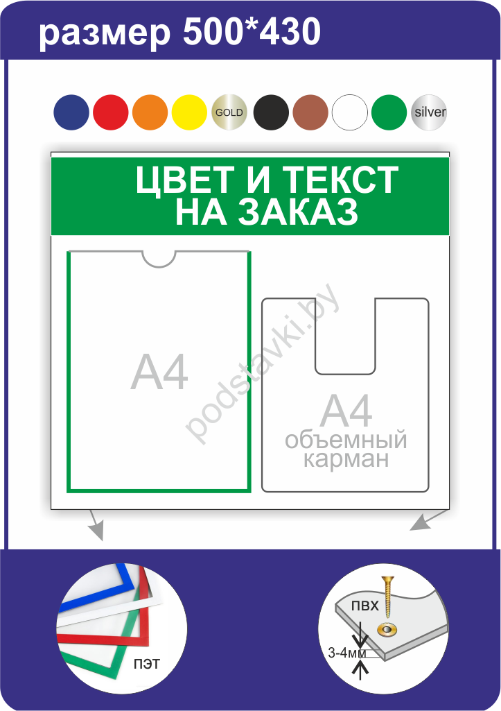 Материал информационного стенда: ПВХ 3 мм Карманы: литые карманы (кант может быть цветным белый, красный, черный, синий) Верхняя надпись: синий, красный, + возможно печать другого цвета с лого