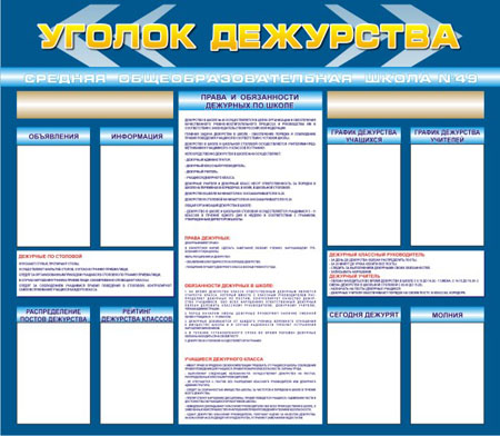 СТЕНДЫ ДЛЯ ШКОЛЫ Стенды для школы - это информация, а также элемент воспитания учащихся в духе высокой морали и гордости за свою школу. И те, кто думает, что оформление школьного стенда не отличается от обычного информационного стенда, безусловно ошибаются. В школе к стендам предъявляются особые требования, обеспечивающие их долгую жизнь в условиях сверх активной школьной среды.Специфика аудитории школьников заслуживает отдельного внимания дизайнеров и психологов, желающих донести полезную воспитательную информацию до детей.Восприятие школьников отличается от взрослого, поэтому требуется соблюдение основных законов психологии восприятия при разработке иллюстративных материалов, а тем более – плакатов и стендов безопасности. Стенды для школы обычно изготавливаются с разными целями – это и воспитательные стенды, стенды безопасности, гигиены, пропаганды здорового образа жизни и стенды по профориентации и обычные информационные стенды, служащие для информирования учеников, учителей и родителей об изменениях и событиях школьной жизни. В зависимости от назначения стендов, выбираются различные конструкции и материалы.